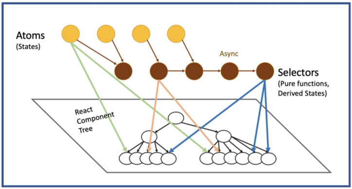 - selector : 다른 atom들 혹은 selector들을 받아 사용하는 순수 함수로, atom의 상태에 의존한 동적인 데이터를 파생시킵니다. 받은 atom들 혹은 selector들 중 어떤 것이 업데이트 되면, selector 함수는 다시 평가되고 컴포넌트가 리렌더링 됩니다.